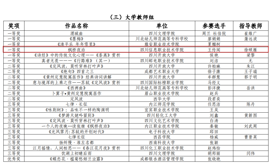 日前,四川省教育厅发布了《关于四川省2023年中华经典诵写讲演系列活动省级作品的公示》,人文学院教师徐硕雁指导的作品《枫桥夜泊》获2023年四川省中华经典诵写讲演系列活动一等奖。