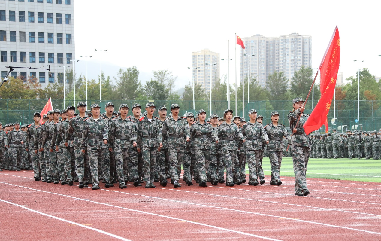 在军训汇报表演环节,新生们进行了队列队形、军体拳、匕首操、战略战术等军训考核科目展示。