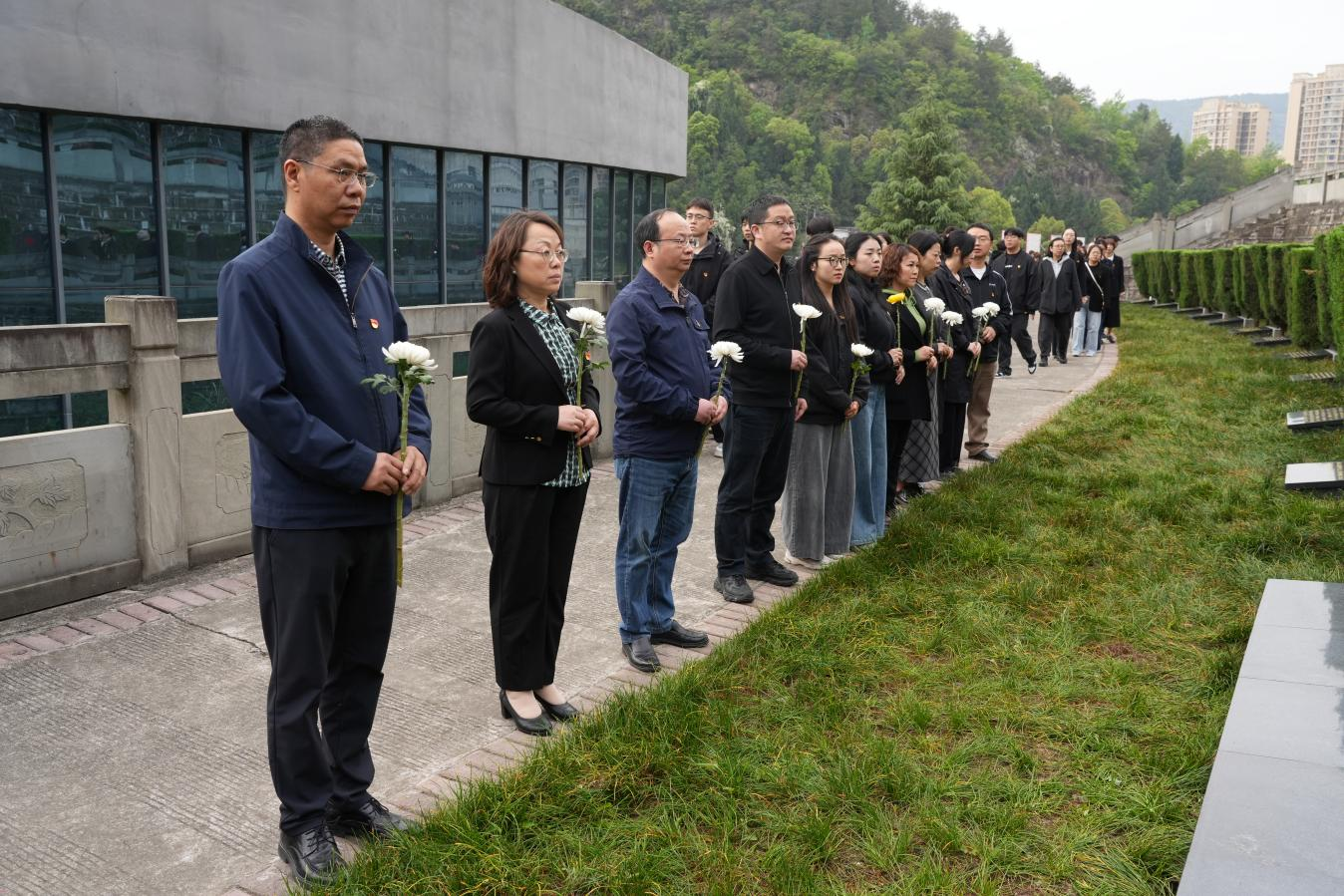 全体师生缓步绕行,瞻仰烈士纪念碑。在烈士墓区,师生们擦拭墓碑、敬读碑文,向烈士们献上鲜花并行鞠躬礼,深情缅怀革命先烈。