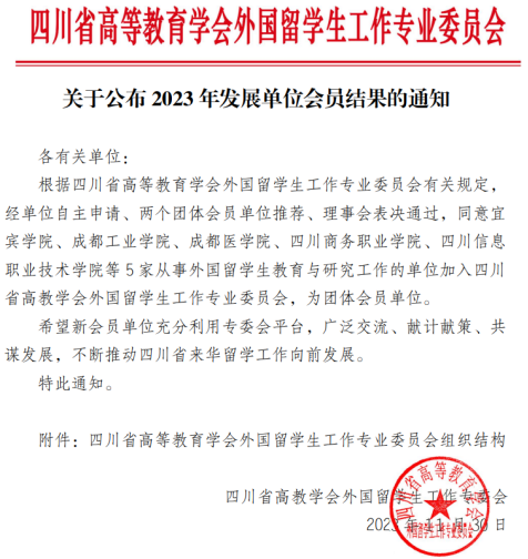 为进一步规范学院来华留学生管理,提高来华留学生培养质量,推进留学生教育体制机制创新,服务区域经济社会发展,学院积极申请加入四川省高教学会外国留学生工作委员会,经过前期材料准备、自主申报、两个团体会员单位推荐、理事会表决通过,于今年11月加入四川省高教学会外国留学生工作专业委员会,为团体会员单位。