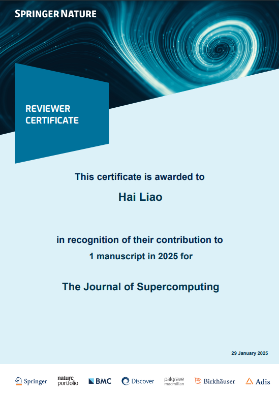 近日,我院软件学院教师廖海受国际权威SCI学术期刊《The Journal of Supercomputing》 (《超级计算杂志》)编委会邀请,担任该期刊审稿专家。