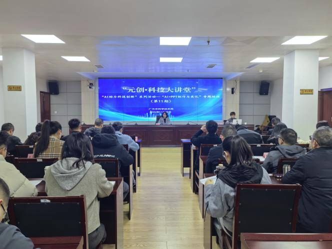 11月28日,学院教务处教师瞿艺应邀为广元市科学技术局开展“元创•科技大讲堂——AI+PPT制作与美化”专题培训。市科学技术局党组成员、机关党委书记王希予,机关全体干部职工及直属事业单位相关人员参加培训。