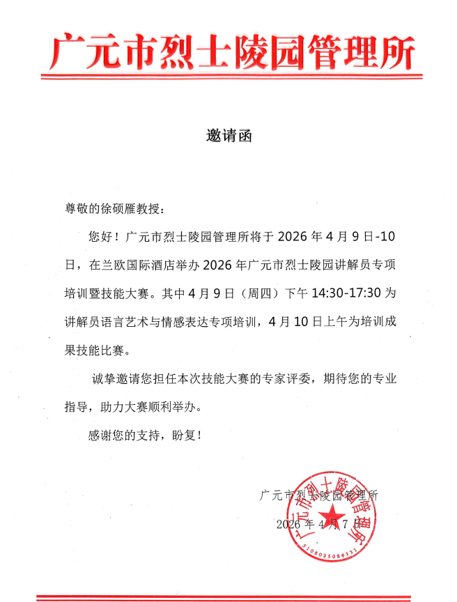 4月9日至10日,由广元市烈士陵园管理所主办的“2026年广元市烈士陵园讲解员专项培训暨技能大赛”在兰欧国际酒店举行,我院人文学院教师徐硕雁应邀作为专家评委全程参与活动,并为参训学员开展专题培训。