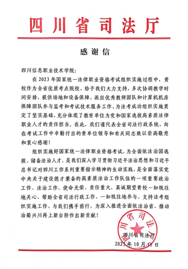 10月15日,四川省司法厅发来感谢信,对学院大力支持2023年国家统一法律职业资格考试并保障考试工作顺利完成表示感谢。