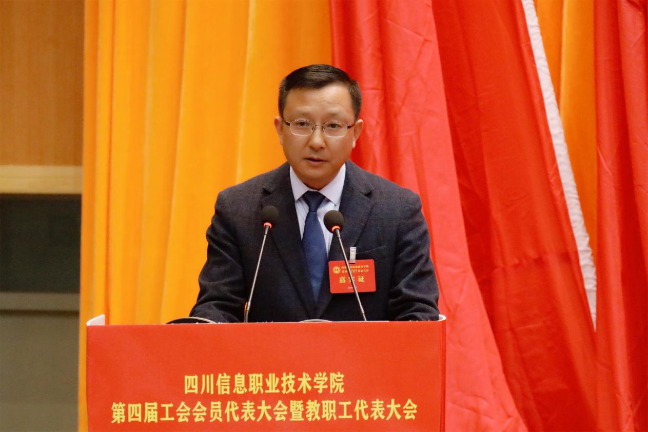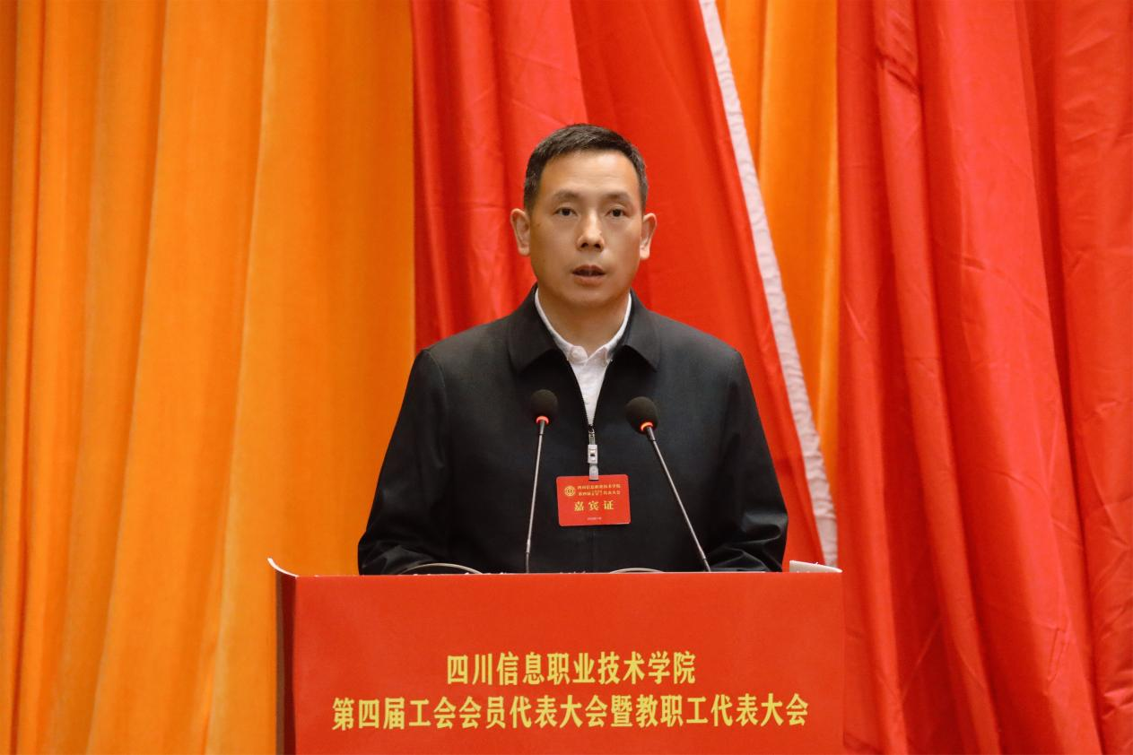杨元代表中国教育工会广元市委员会向大会的顺利召开表示祝贺。杨元指出,在省经信厅党组和广元市委市府的大力关怀和支持下,学院的工作年年都有新的突破,学院发展所取得的成绩有目共睹。他希望新一届工会委员会在未来的工作中要坚持党的领导、提升政治站位,切实履行维权职责、关爱教职工,积极推动学院民主管理、强化教职工的主人翁意识,加强自身建设、提高服务水平,团结动员广大职工为推动学院高质量发展而努力奋斗。