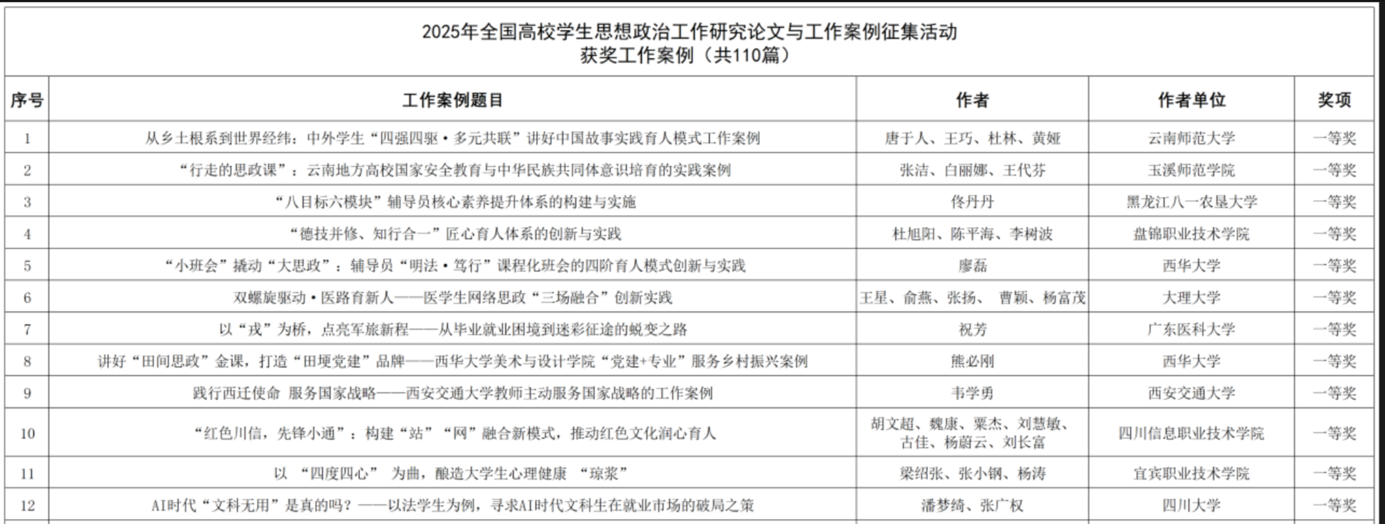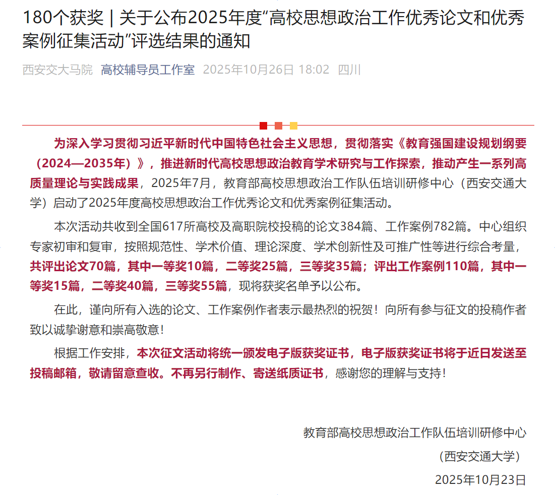 近日,教育部高校思想政治工作队伍培训研修中心(西安交通大学)公布2025年度“高校思想政治工作优秀论文和优秀案例征集活动”评选结果。网络与通信学院“‘红网匠心’大学生思想政治工作创新团队”撰写的工作案例《“红色川信,先锋小通”:构建“站”“网”融合新模式,推动红色文化润心育人》获工作案例一等奖。