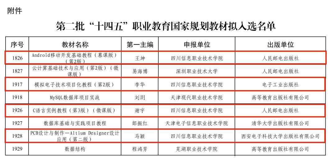 近日,教育部公示了第二批“十四五”职业教育国家规划教材名单,王坤主编的《Android移动开发基础教程(慕课版)(第2版)》、李华主编的《模拟电子技术项目化教程(第2版)》、谢宇主编的《C语言实例教程(第3版)(微课版)》、马颖主编的《PCB设计与制作一Altium Designer设计应用(第二版)》4部教材成功入选。
