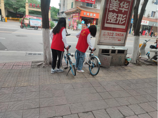志愿者将共享单车摆放整齐
