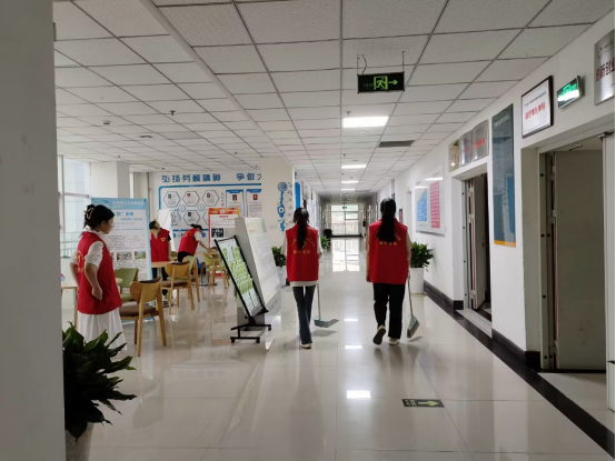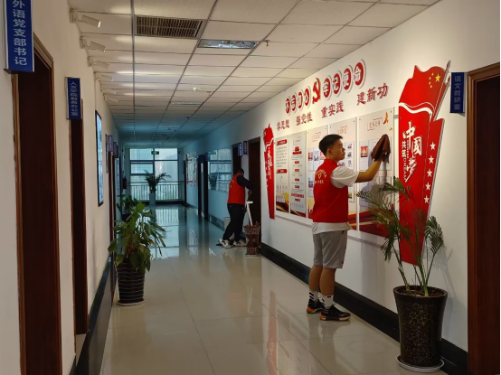活动中,志愿者分工明确、团结合作,利用提前准备好的抹布、扫帚等劳动物品,认真清扫教室、楼道、以及公共区域地面、擦拭墙上以及桌上污迹和卫生死角,高质量地完成志愿服务清扫任务。