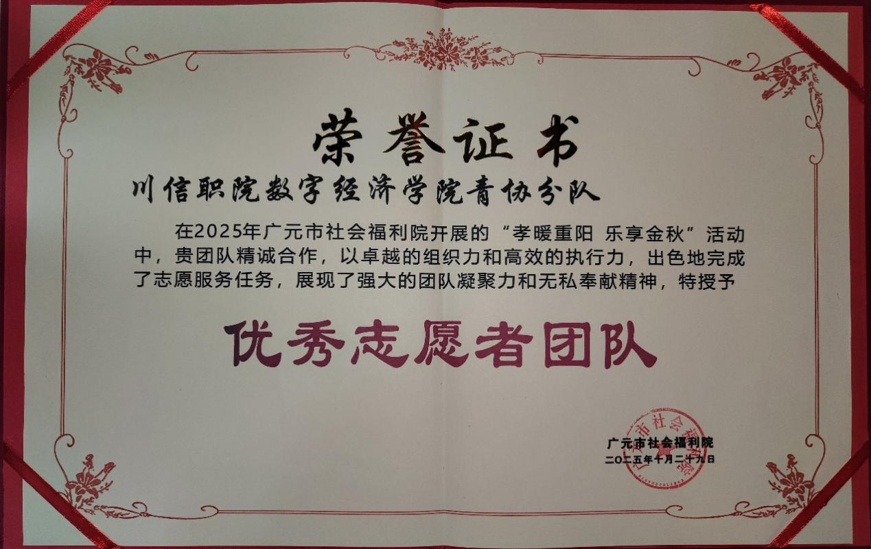 最后,广元市社会福利院为数字经济学院青协分队颁发了“优秀志愿者团队”荣誉证书。