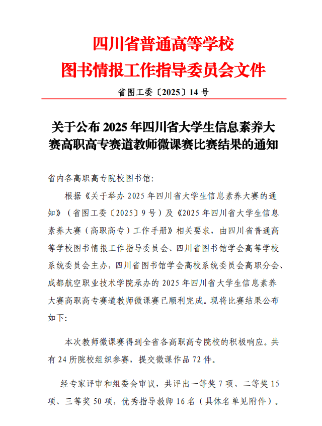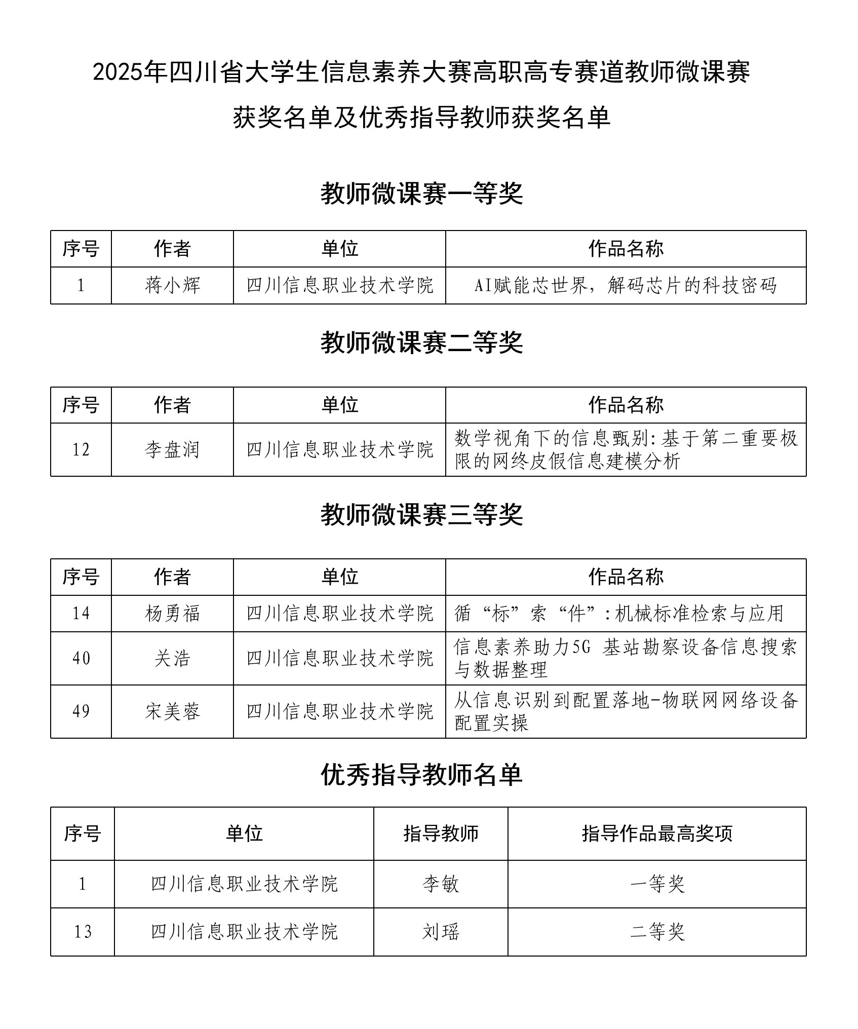 近日,四川省普通高等学校图书情报工作指导委员会公布了2025年四川省大学生信息素养大赛高职高专赛道教师微课赛获奖名单及优秀指导教师获奖名单。我院教师凭借出色的教学设计与扎实的信息素养,在全省24所院校提交的72件微课作品中脱颖而出。其中,教师蒋小辉以第一名的成绩荣获一等奖,教师李盘润获得二等奖,教师杨勇福、关浩、宋美蓉分别获得三等奖;教师李敏、刘瑶被授予“优秀指导教师”荣誉称号。
