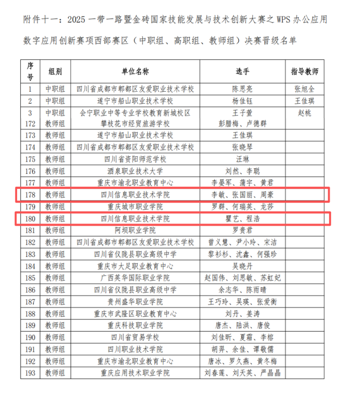 近日,在2025年一带一路暨金砖国家技能发展与技术创新大赛首届WPS办公应用数字应用创新赛西部赛区选拔赛中,我院教师李敏、张国丽、周豪荣获教师组一等奖,瞿艺、程浩荣获教师组二等奖,并晋级全国总决赛。