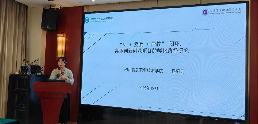 学院招生就业处(创新创业学院)教师杨蔚云,作为本次年会分享嘉宾中唯一的高职院校代表,受邀在大学生创新创业实践优秀案例分享会作《“AI+竞赛+产教”闭环:高职创新创业项目的孵化路径研究 》专题报告。