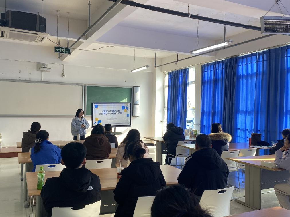 12月26日,由广元市教育科学研究所主办、学院学生处心理健康教育中心承办的广元市第二期心理健康教研活动在雪峰校区举行。活动由广元市大中小学心理健康教育专家指导委员会主任赵丽副教授主持,学院学生处心理健康教育中心乔玲老师以“从家庭治疗理论视角理解青少年心理行为问题”为题作了专题分享,全市大中小学20余名心理健康教育工作者来院参与活动。