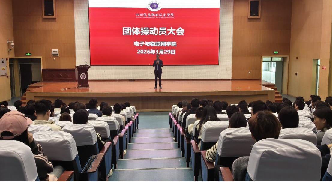3月29日,电子与物联网学院在雪峰校区学术交流中心报告厅召开了2026年春季学生田径运动会团体操动员大会。该院党总支负责人周仕国、团总支负责人李超、全体辅导员以及参演学生参加会议。