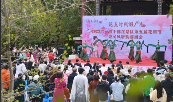 活动以千佛崖历史文化为底蕴,花朝节传统习俗为内涵,为游客们奉上一场花之盛宴。活动现场,十二花神身着汉服踏春而来,衣袂飘飘,翩若惊鸿,让人宛如穿越古代,置身百花盛宴;汉服同袍们载歌载舞,各展才艺,传递了对春天和美好未来的祈愿,随后,花神簪花,为大家送上最美好的祝福,共同开启一场穿越千年的春日。